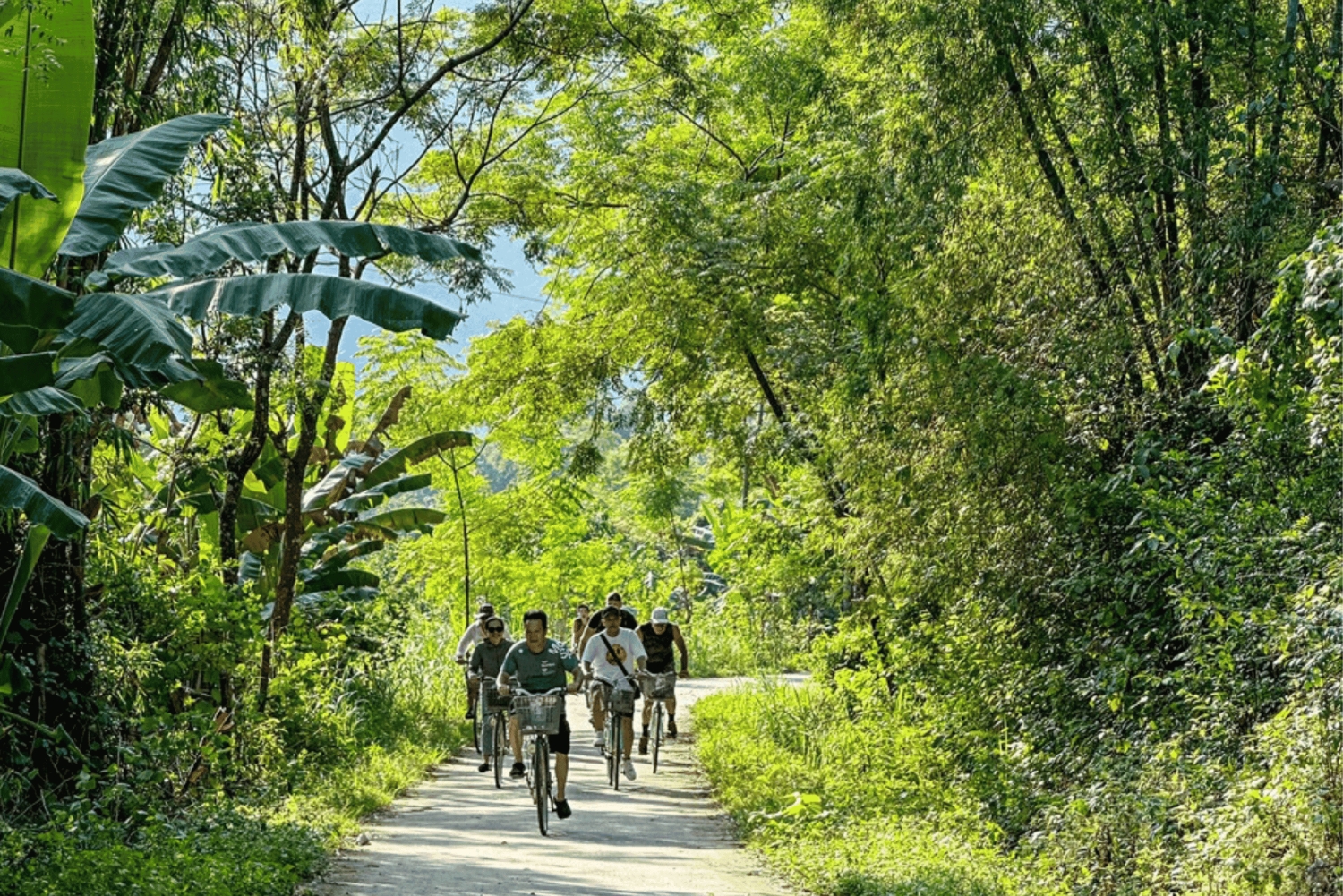 À tarde, pega nas bicicletas e começa a pedalar. Há muitos trilhos de bicicleta bonitos no vale de Mai Chau que te levam através de aldeias pitorescas, arroz e campos de cultivo. Ao longo do caminho, podes parar a qualquer momento para captar belos momentos da natureza ou falar com um aldeão simpático.