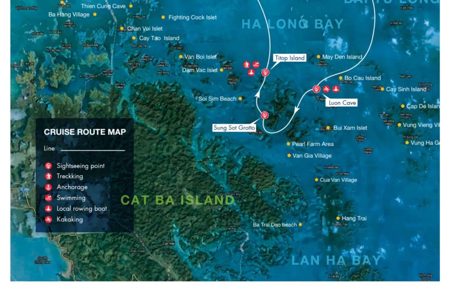 15h15: Visita a Ilha TiTop, onde pode relaxar na praia de areia, nadar ou caminhar até o topo da ilha para ter uma vista panorâmica da BaÃa de Halong.