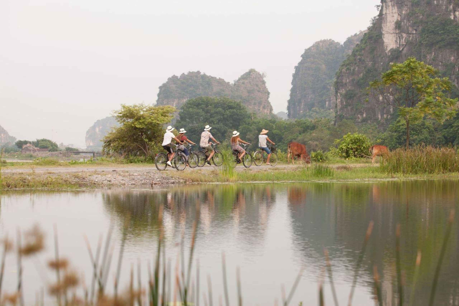 Descubra Ninh Binh em um dia: visite a antiga capital de Hoa Lu, faça um passeio de barco panorâmico em Tam Coc e caminhe até a Caverna Mua para desfrutar de vistas deslumbrantes do campo e das montanhas de calcário.
