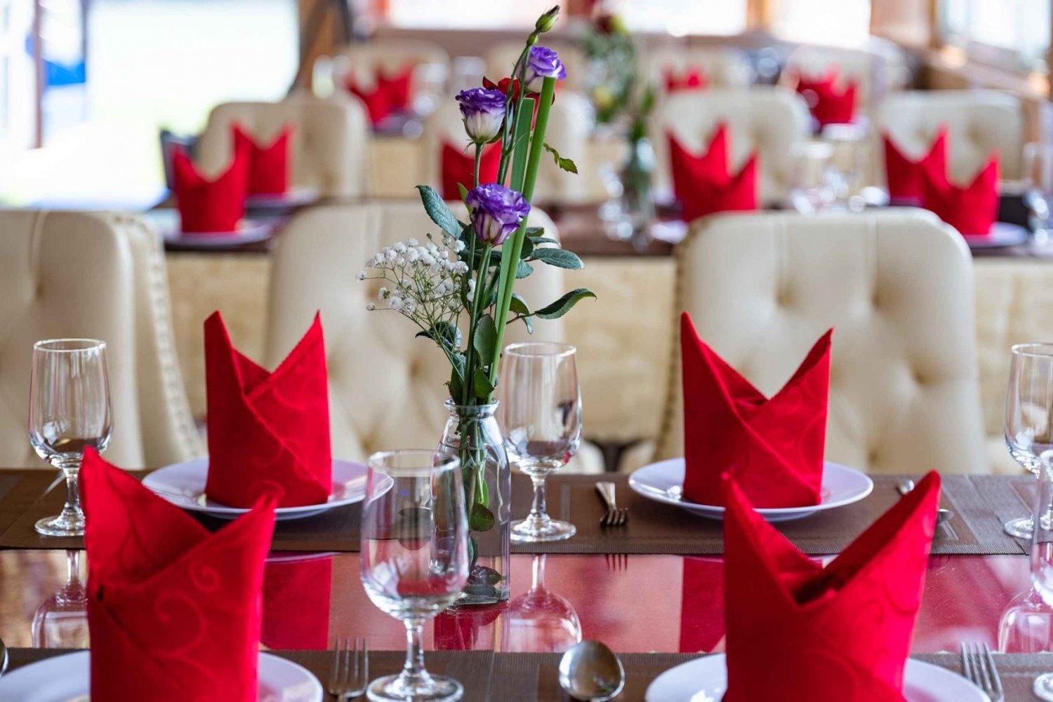 - Desfrute de uma festa ao pôr do sol no barco com vinho tinto, bolo, frutas e muito mais