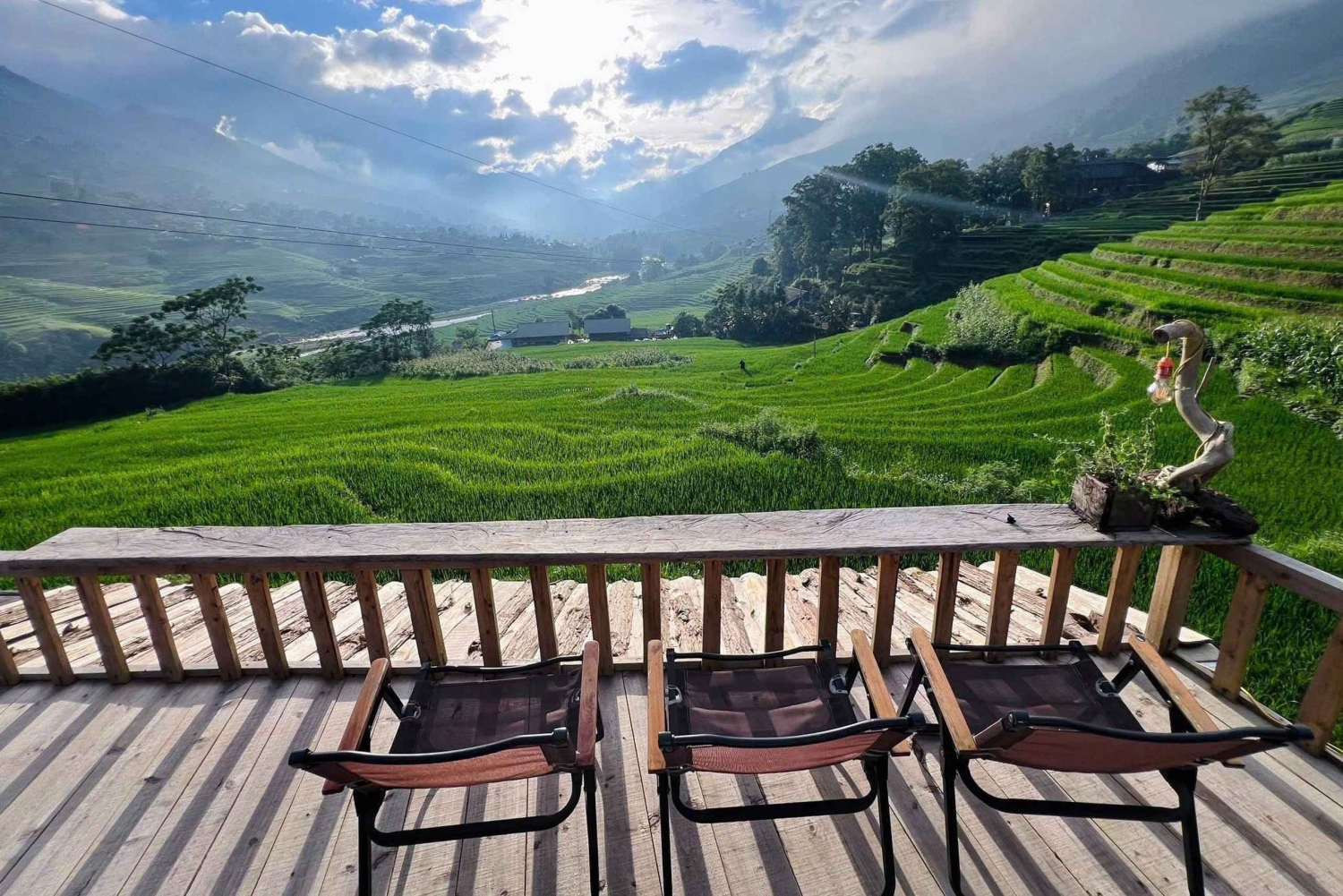 Após o pequeno-almoço, parta para uma caminhada panorâmica que desce por arrozais em socalcos e atravessa o riacho Muong Hoa até à aldeia Black H'Mong de Lao Chai. Continue ao longo do vale até Tả Van, lar do povo Dzay, passando por trilhos de búfalos e pontes de bambu numa rota de 8 a 10 km (dificuldade 2/5).
