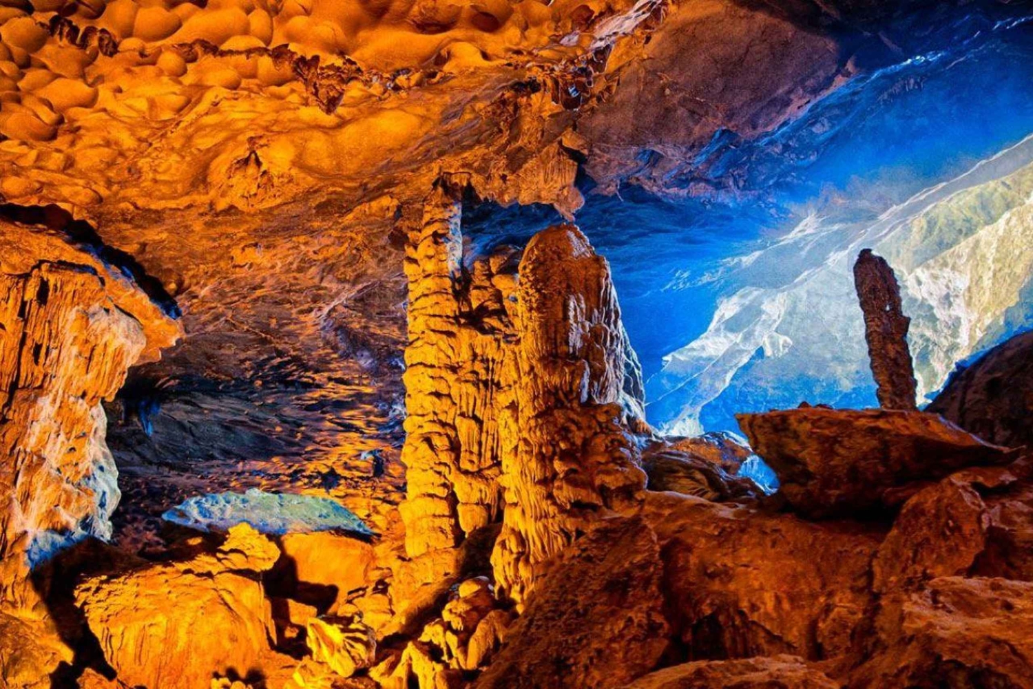 Depois do almoço, o barco aproxima-se da primeira área turística da viagem, onde vamos explorar a Gruta Sung Sot - a maior, mais longa e mais bonita gruta da Baía de Ha Long.
