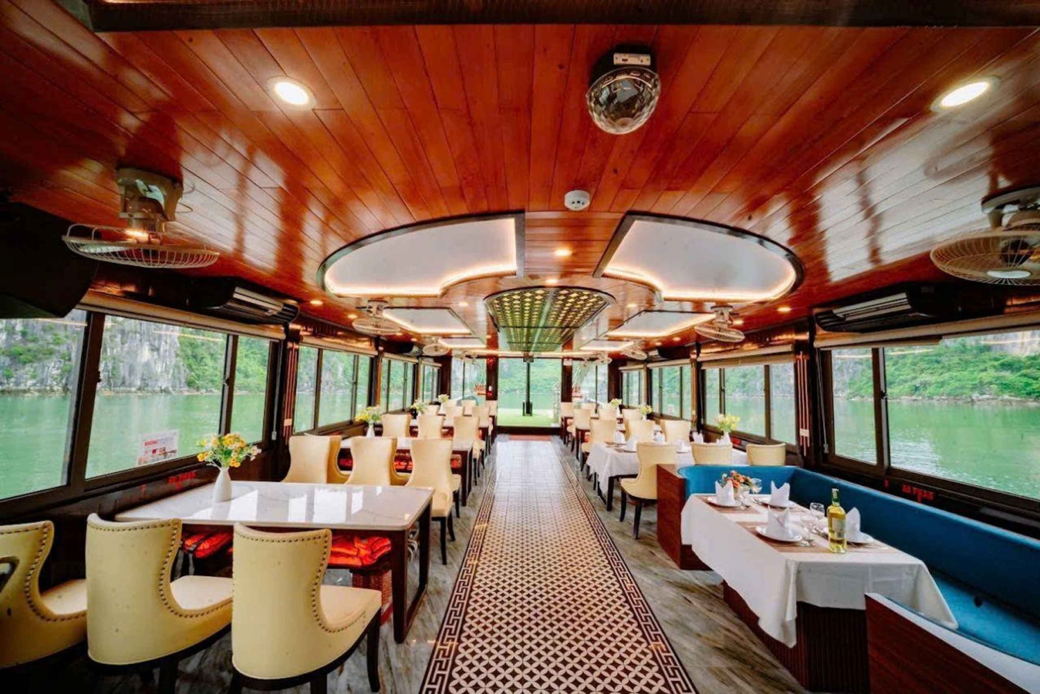 Bem-vindo ao barco e desfruta do almoço com pratos tradicionais vietnamitas enquanto navegas por milhares de ilhas de calcário, como: Hon Cho Da, Hon Trong Mai e especialmente Hon Ga Choi - o símbolo da Baía de Ha Long.
