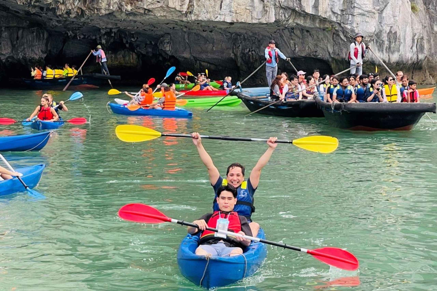 O barco seguirá depois para a área de Hang Luon - uma gruta aquática para praticar caiaque (2 pessoas por caiaque) ou remo num barco de bambu (10 a 12 pessoas por barco) ou simplesmente ficar no barco para relaxar.