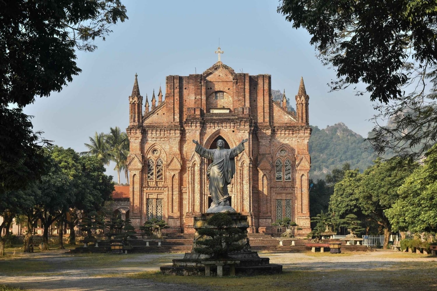 O santuário de tijolos vermelhos: o Mosteiro de Chau Son. Nossa jornada começa no Mosteiro da Santa Mãe de Chau Son, uma obra-prima gótica escondida em um vale montanhoso isolado. Construído no início do século XX com um milhão de tijolos vermelhos feitos à mão, colocados sem uma única camada de gesso, este santuário é um milagre arquitetônico. Ao caminhar pelos claustros silenciosos e ensolarados e pelo contemplativo 'Jardim de Pedra', você sentirá uma mistura surreal de alma europeia e espiritualidade cárstica vietnamita. É um lugar de silêncio profundo, aberto apenas para quem sabe quando procurá-lo.