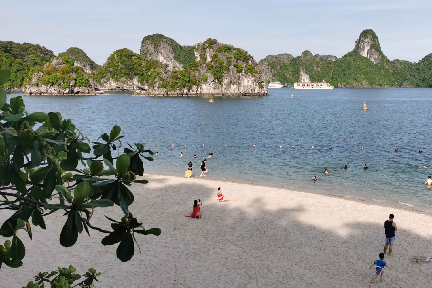 Отправляйтесь на пляж, чтобы искупаться в чистой воде или позагорать на пляже. Вернитесь на лодку и отправляйтесь обратно в гавань Туан Чау. По пути насладитесь закатом и чаем вьетнамского чая.