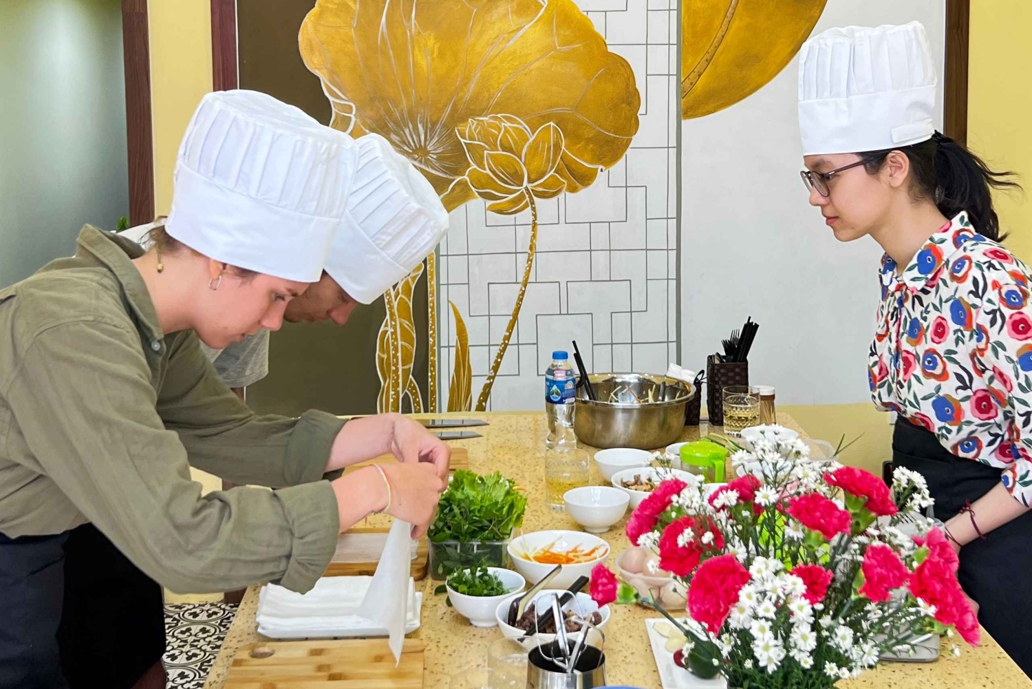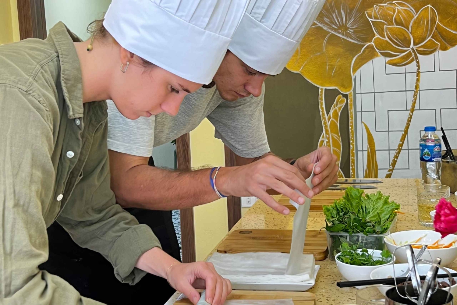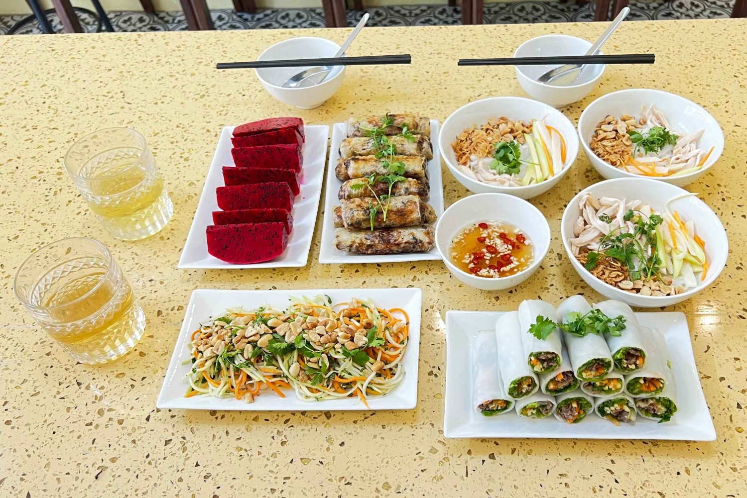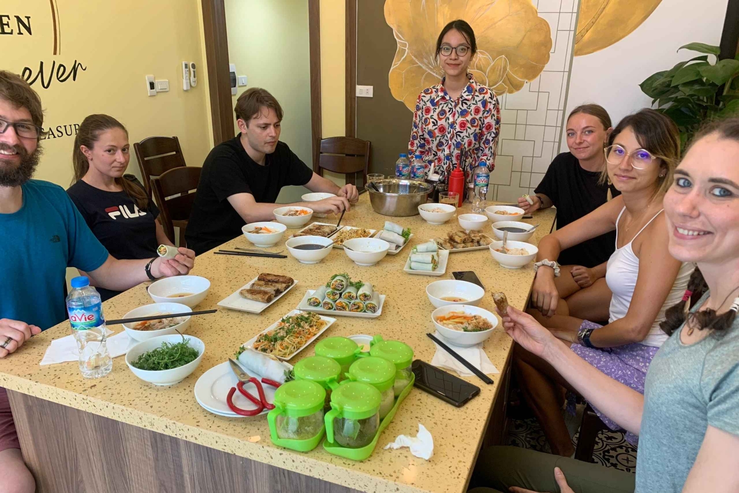 После посещения рынка отправляйтесь на кухню на кулинарный урок. Ваш инструктор по кулинарии покажет вам, как приготовить четыре классических вьетнамских блюда (жареные спринг-роллы, салат из папайи, роллы фо, смешанный фо) и вьетнамский фирменный яичный кофе.