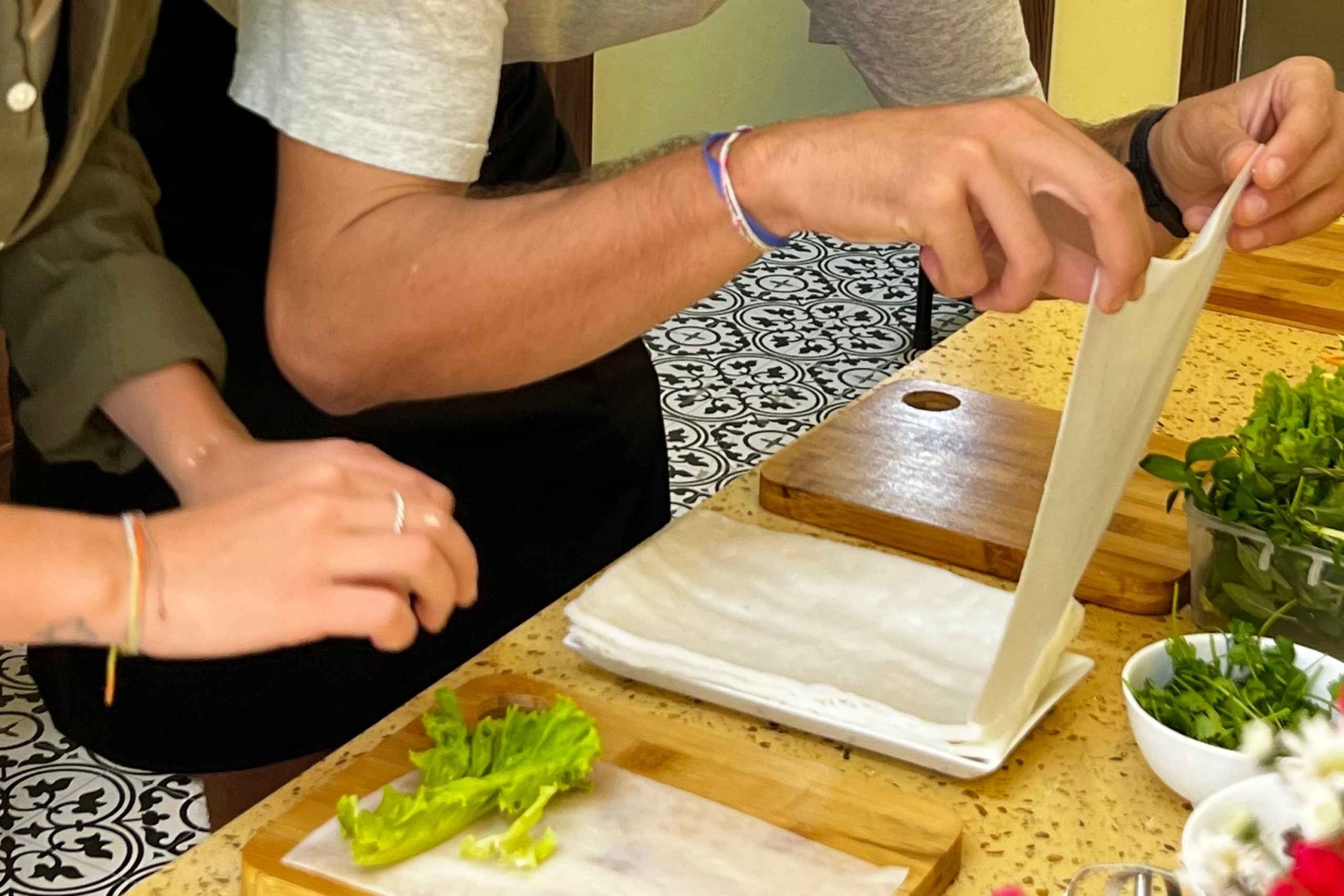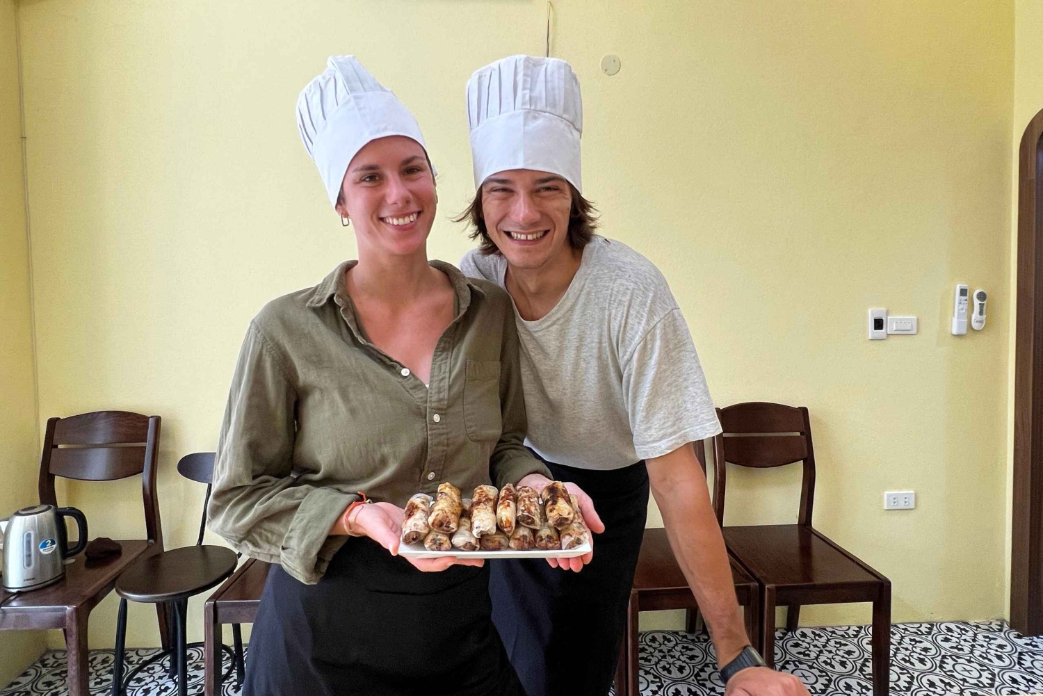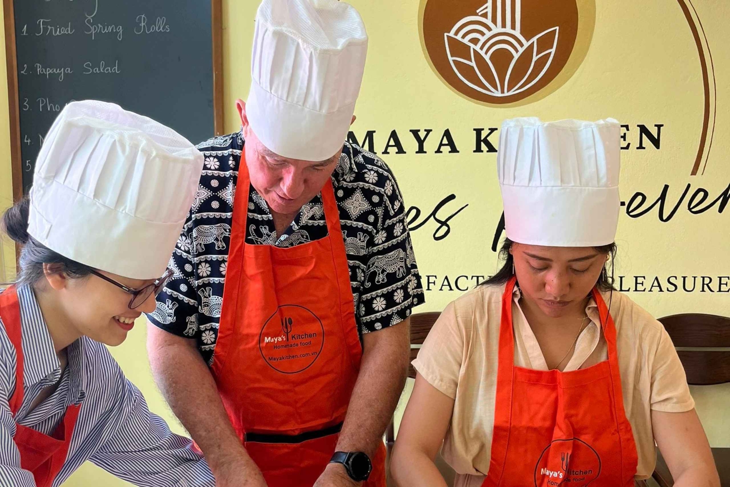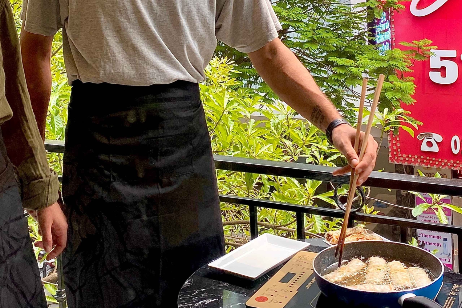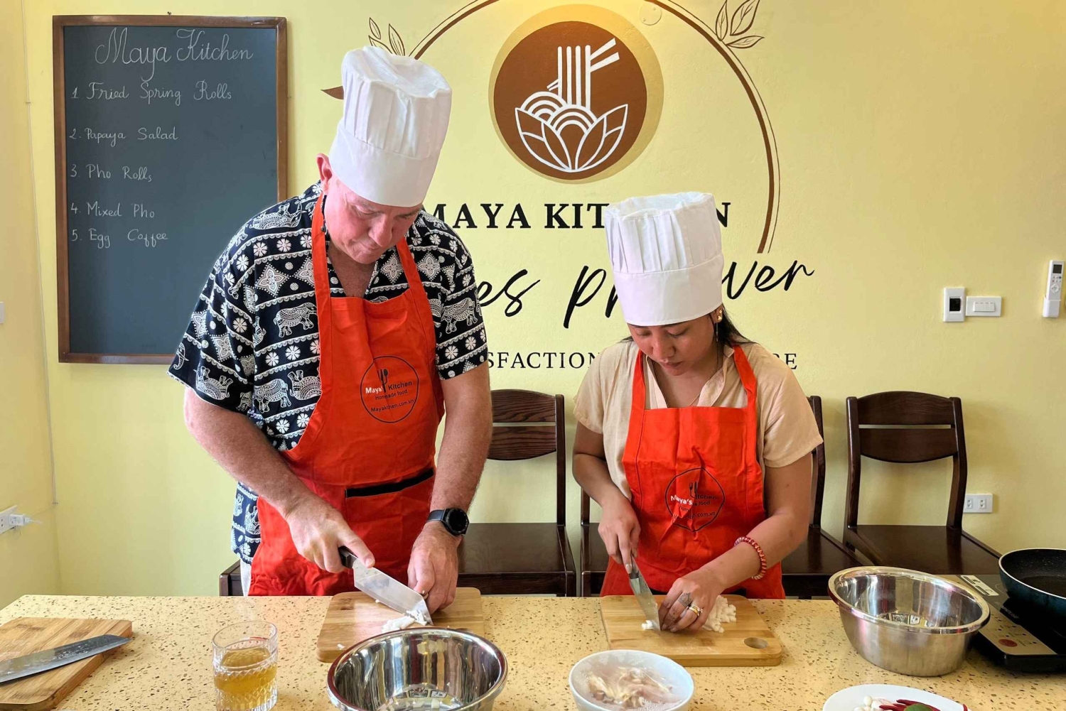 После посещения рынка отправляйтесь на кухню на кулинарный урок. Ваш инструктор по кулинарии покажет вам, как приготовить четыре классических вьетнамских блюда (жареные спринг-роллы, салат из папайи, роллы фо, смешанный фо) и вьетнамский фирменный яичный кофе.