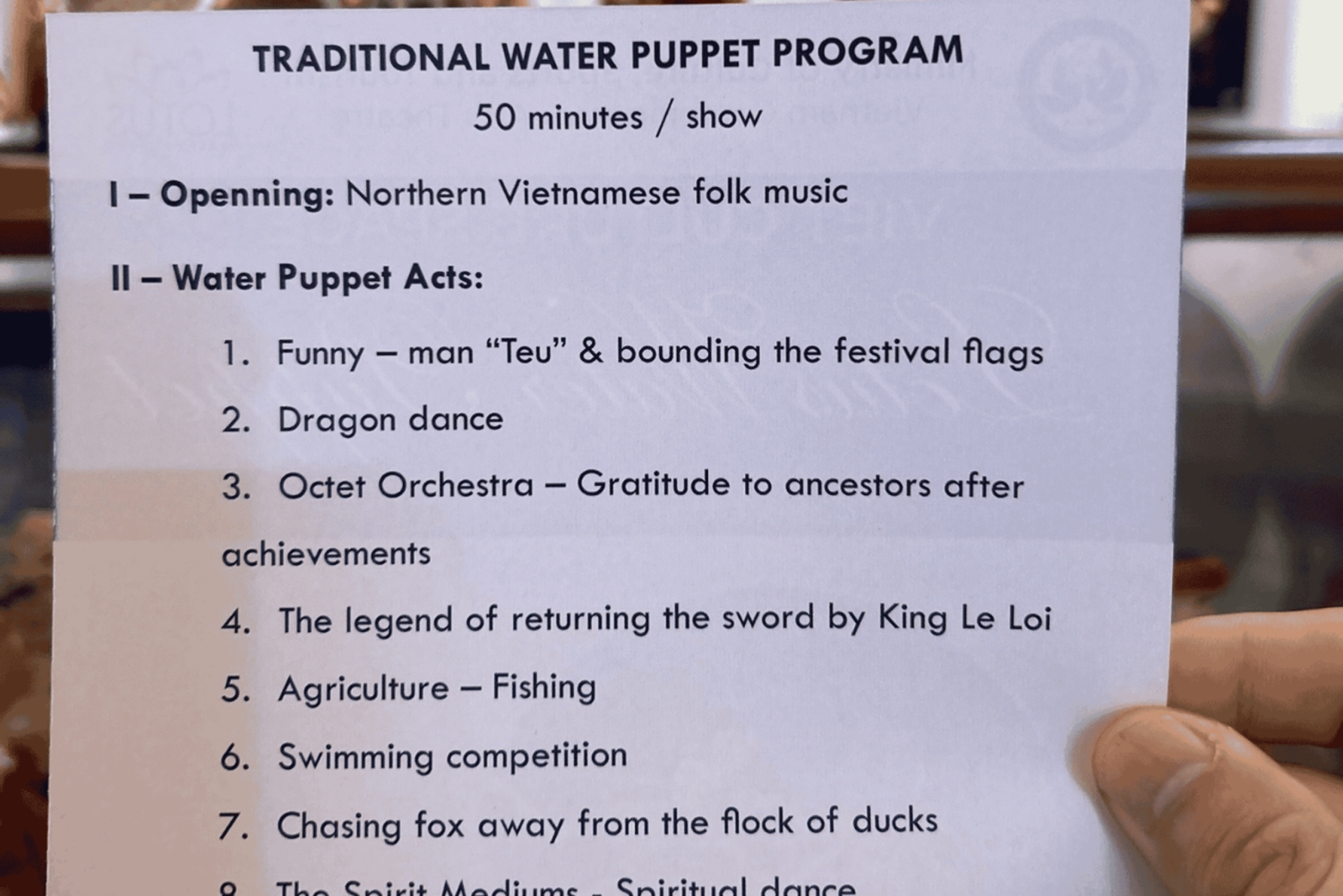 ТРАДИЦИОННАЯ ПРОГРАММА ВОДНЫХ КУКОЛ: 50 минут/представление 1. Открытие: народная музыка Северного Вьетнама II. Выступления водных кукол: 1. Весельчак «Теу» и поднятие праздничных флагов 2. Танец дракона 3. Октет-оркестр — благодарность предкам за достижения 4. Легенда о возвращении меча королем Ле Лой