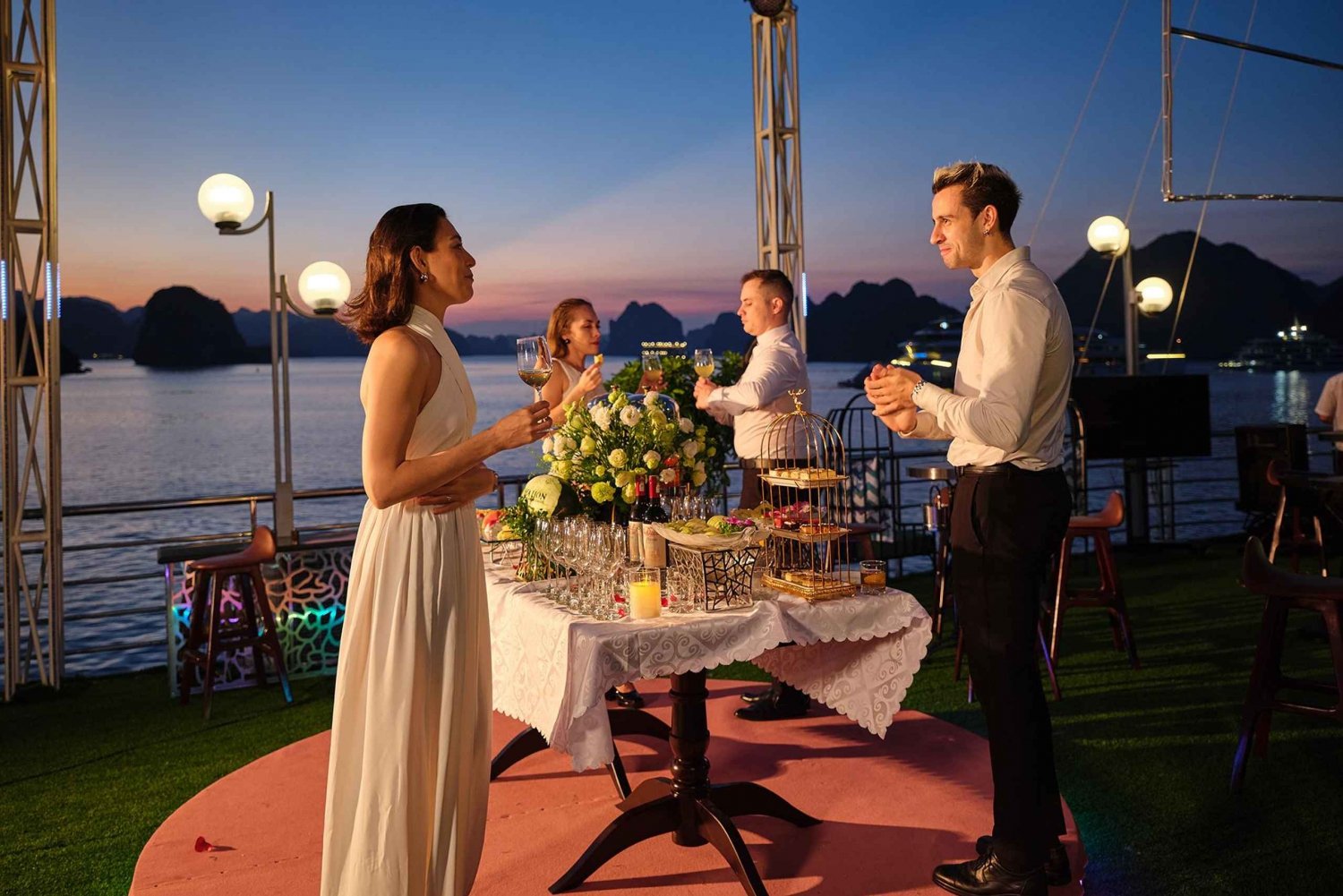 Вернитесь в гавань и насладитесь вечеринкой на закате с чаем, пирожными и солнечными ваннами на верхней палубе под музыку. Затем вернитесь в Ханой и отправляйтесь в свой отель.
