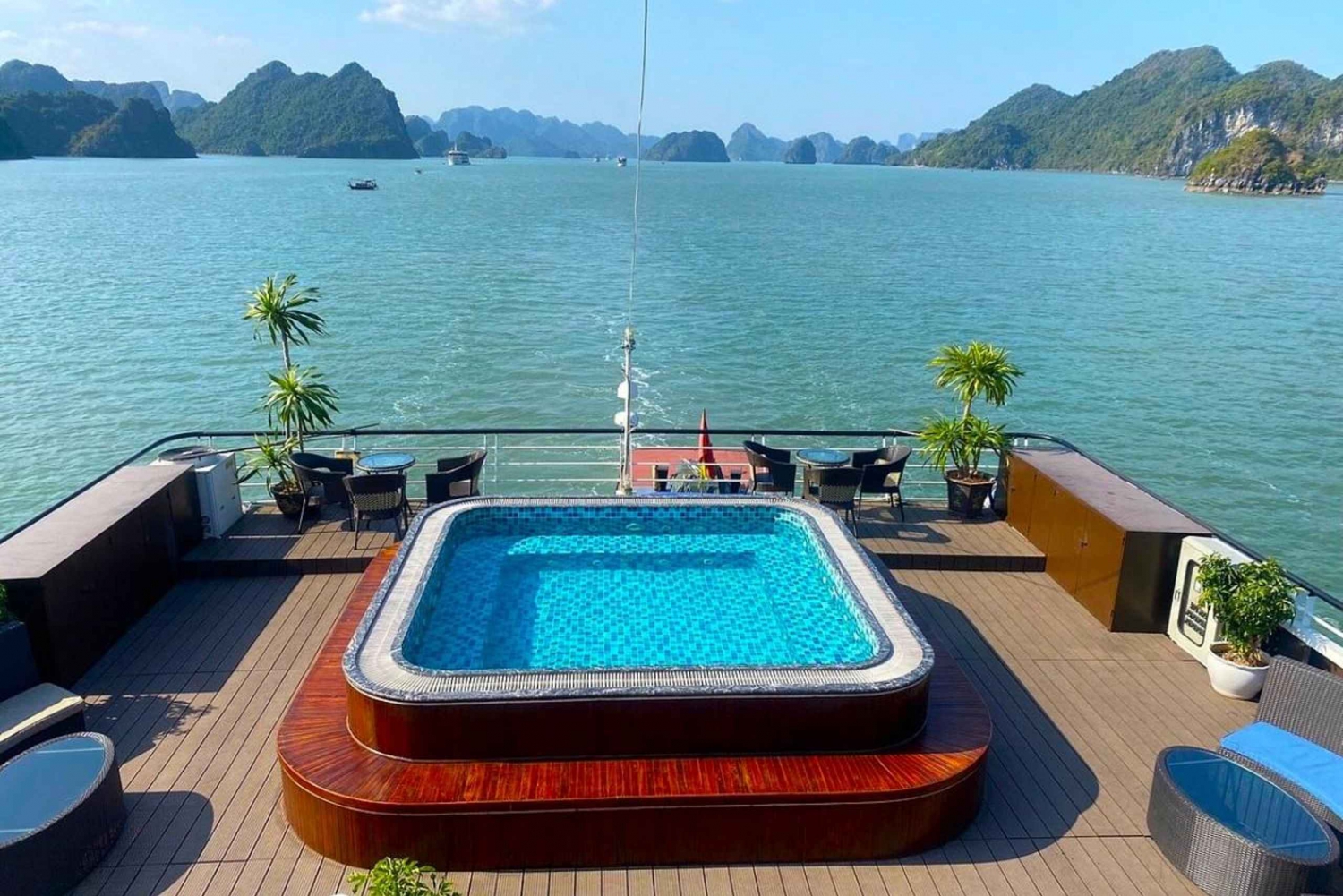 7,5-часовой круиз по самой красивой части бухты Халонг — бухте Лан Ха. Приветственный напиток. Обед «шведский стол» (западная, вьетнамская кухня и морепродукты). Услуги англоговорящего гида. Вечеринка на закате. Кулинарный мастер-класс. Плавание, каякинг, местная гребная лодка, спасательные жилеты. Джакузи под открытым небом. Все входные билеты для осмотра достопримечательностей.