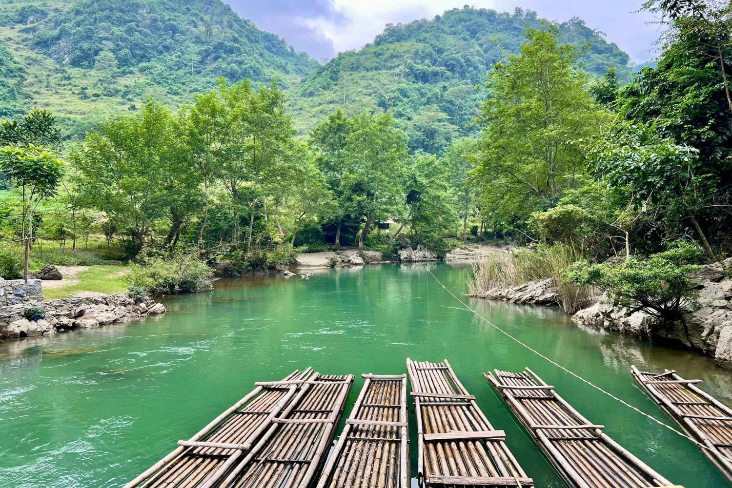 8:30 PÅ MORGONEN: Dags för en båtresa genom Khâu Vai Canyon. Dramatiska klippor, magiskt ljus, bambuflottar - ett charmigt, rustikt äventyr!