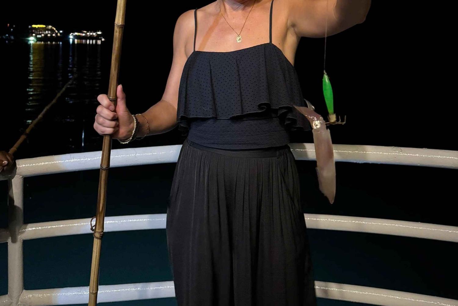 Morgon Tai Chi-lektion på soldäcket och nattbläckfiskfiske