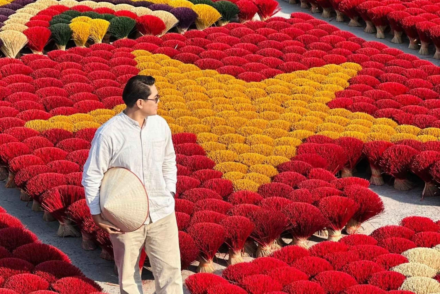 Åk sedan vidare till Quang Phu Cau rökelseby. Fördjupa dig i den fängslande processen att göra rökelse, och engagera dig direkt med lokala hantverkare. Lär dig om det noggranna urvalet av råvaror och den noggranna screeningsprocessen för bambupinnar.