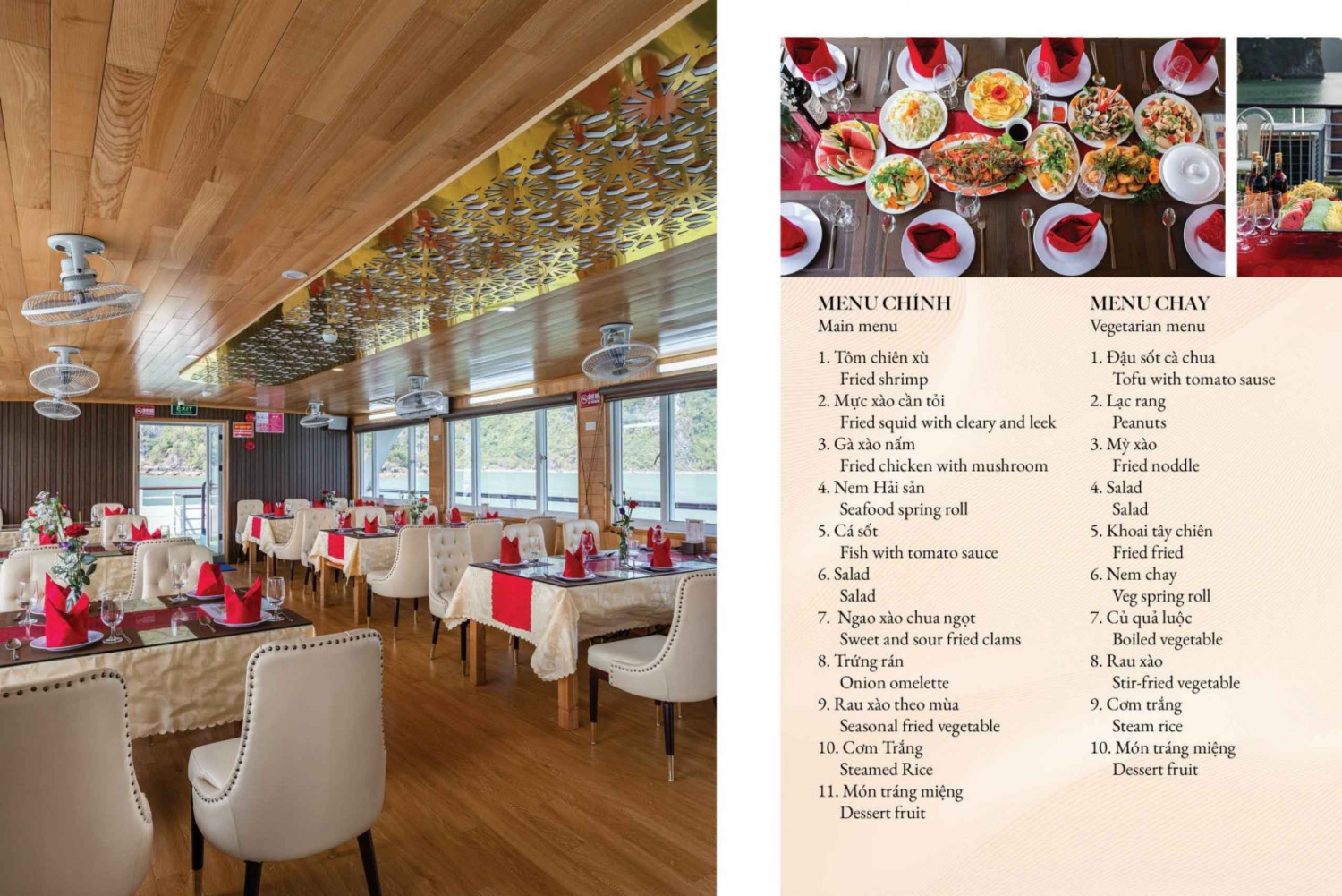 - 12:30: Välkommen ombord och äta vietnamesisk traditionell lunch med skaldjur medan du kryssar