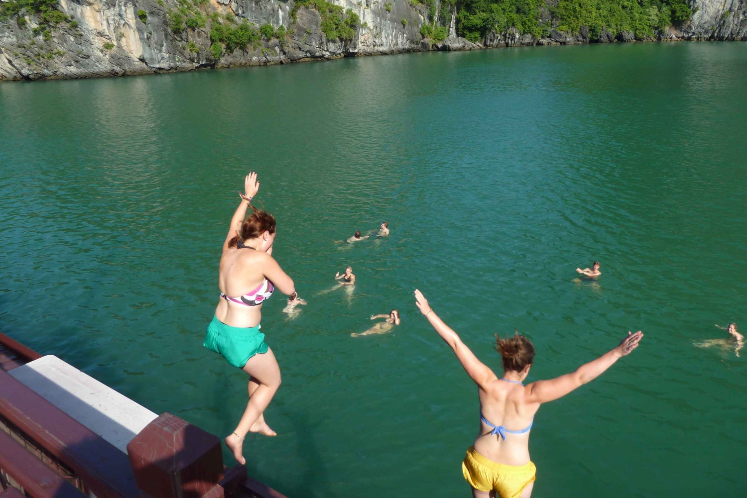 Journey by bus or private car to arrive in Ha Long by 11;00-11:45. A welcome drink will be servered on arrival. Then check in for the cruise. Enjoy a delicious Vietnamese lunch at 13:00 and then head to Bai Tu Long Bay between 15:00 and 15:30. Pass the towns of Hon Gai and Cam Pha, along with Oan Lagoon and the islets of 'Monster Head' and 'Teapot.' Go to the hidden caves of Thien Canh Son to see the staggering stalagmite and stalactite formations. Take a swim in the emerald waters before continuing on your way.