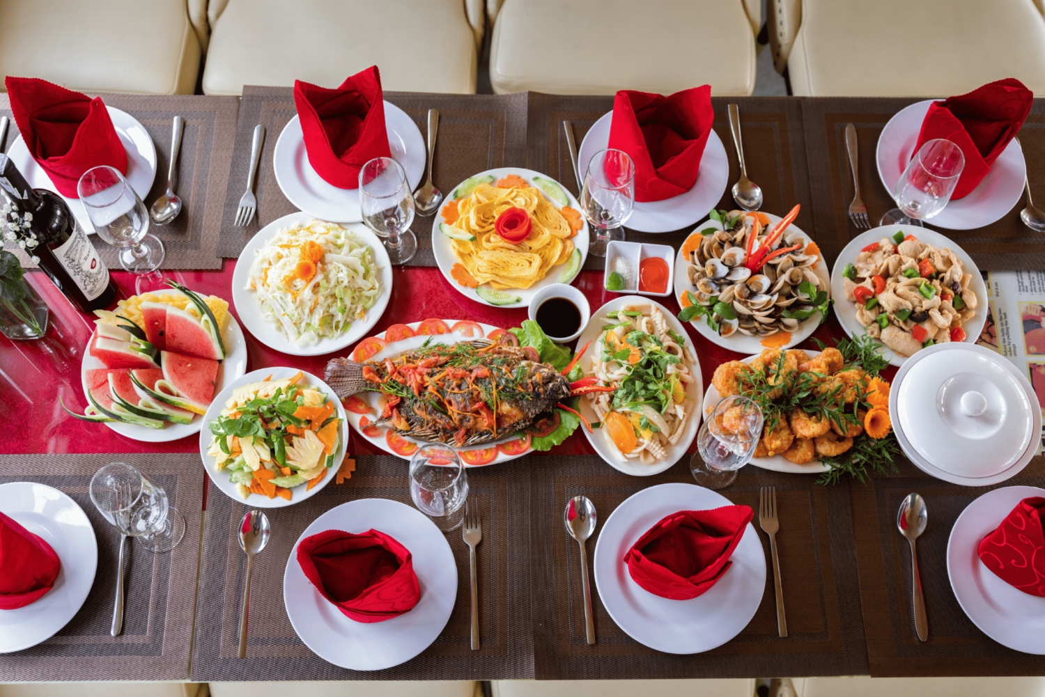 Ha Long Bay sunset party with fruits, tea, and red wine