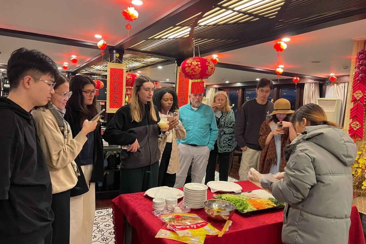 After lunch, visit a Me Cung cave, before heading back to the cruiser for dinner and relaxation onboard. Enjoy a cooking demonstration onboard that shows you how to make authentic Vietnamese spring rolls