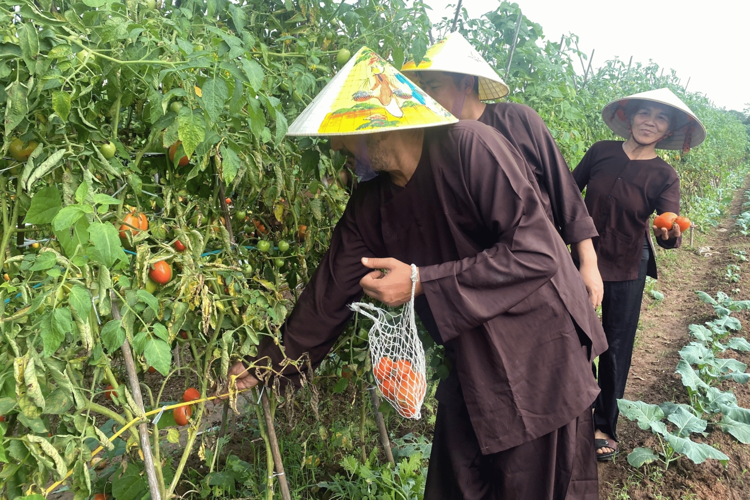 The tour guide welcomes guests at Quan Tinh Communal House. Guests will visit and learn about the Quan Tinh Communal House–Pagoda historical complex. After the visit, guests will head to Uncle Truong’s Garden or Ms. Nam’s Garden to rest and enjoy a light snack before starting the farming activities.
