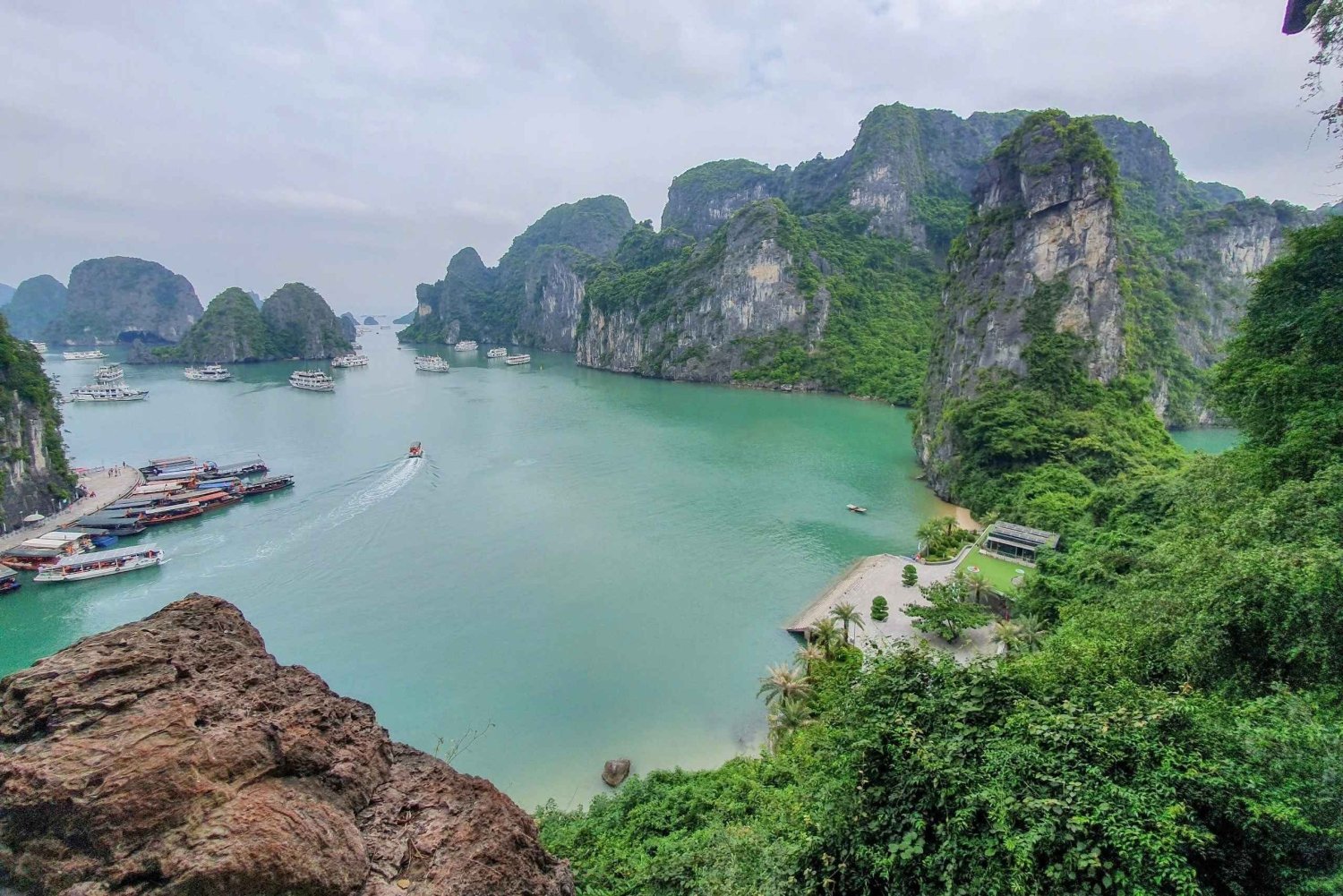 Discover the beauty of Halong Bay on a full-day luxury cruise. Explore the Sung Sot Cave, kayak in the Luon Cave, and visit the sandy beach of Titov Island. Enjoy a sunset party on the sundeck before returning to Hanoi.