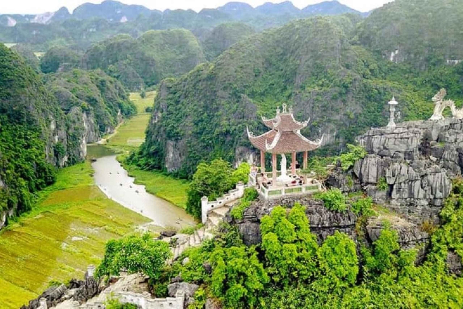 8:00 AM after being collected from the Hanoi Old Quarter, you will embark on your 2.5-hour journey to the Ninh Binh Province. Uncover the cultural and natural heritage of the Ninh Binh province on a guided day trip from Hanoi. Pay a visit to the Bai Dinh Temple Complex, float through the tranquil rivers of Trang An, and climb to the top of Mua Caves for striking panoramic views of rocky hills.