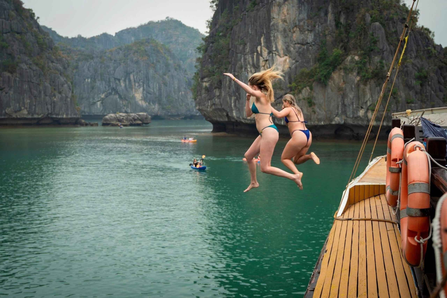 17:30: Visit a local floating fish farm to learn how fishermen live and work on the water. Join a hands-on cooking class onboard, where you'll learn to prepare traditional Vietnamese dishes. Dinner will be served on the boat.