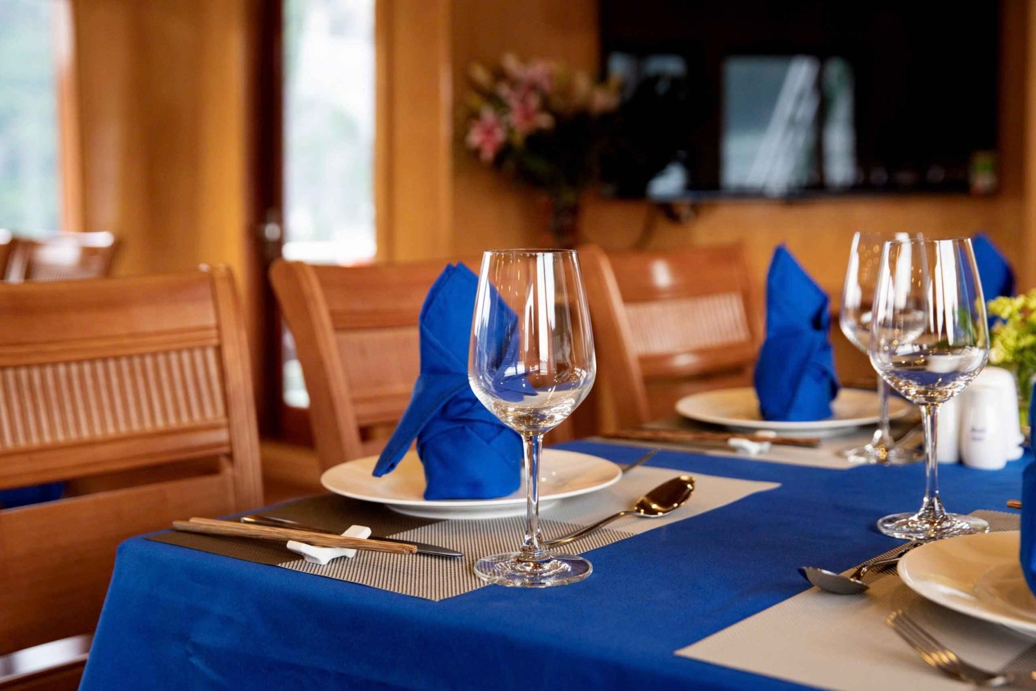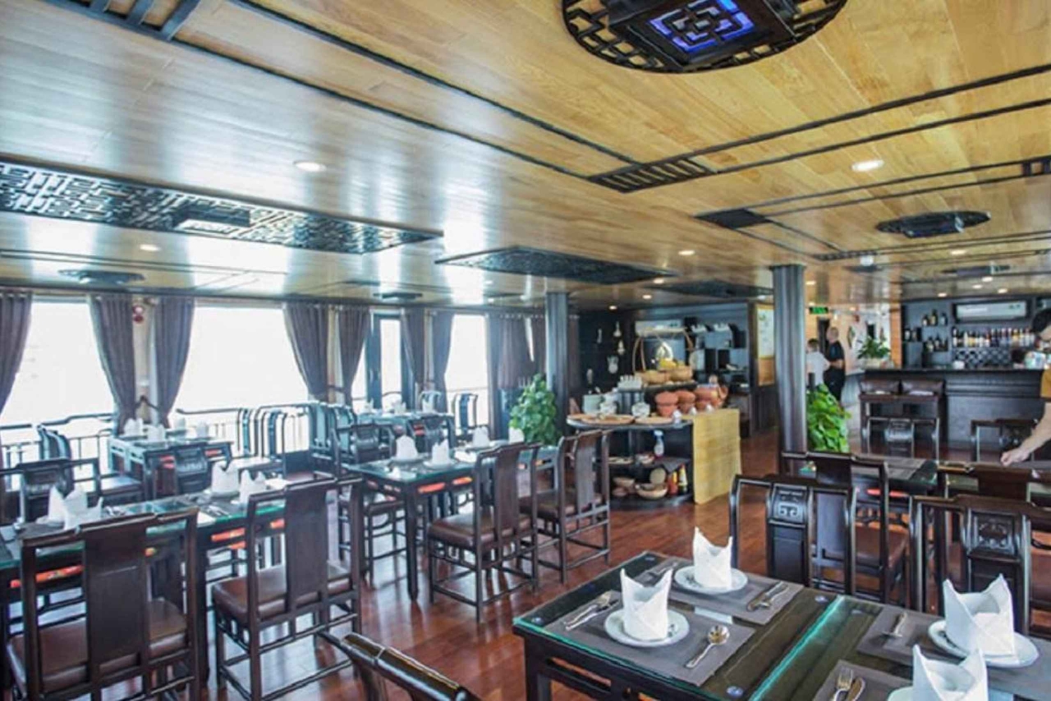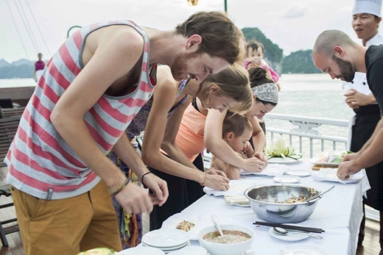 Return to the boat. Don’t miss the stunning sunset over the bay! Join a Vietnamese cooking class with the onboard chef. Dinner with a fresh seafood menu will be served in the restaurant.