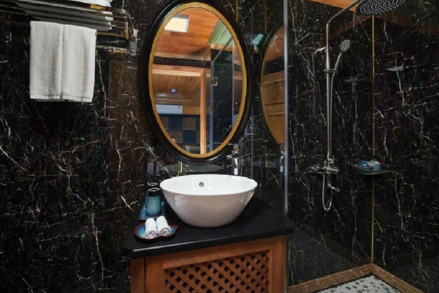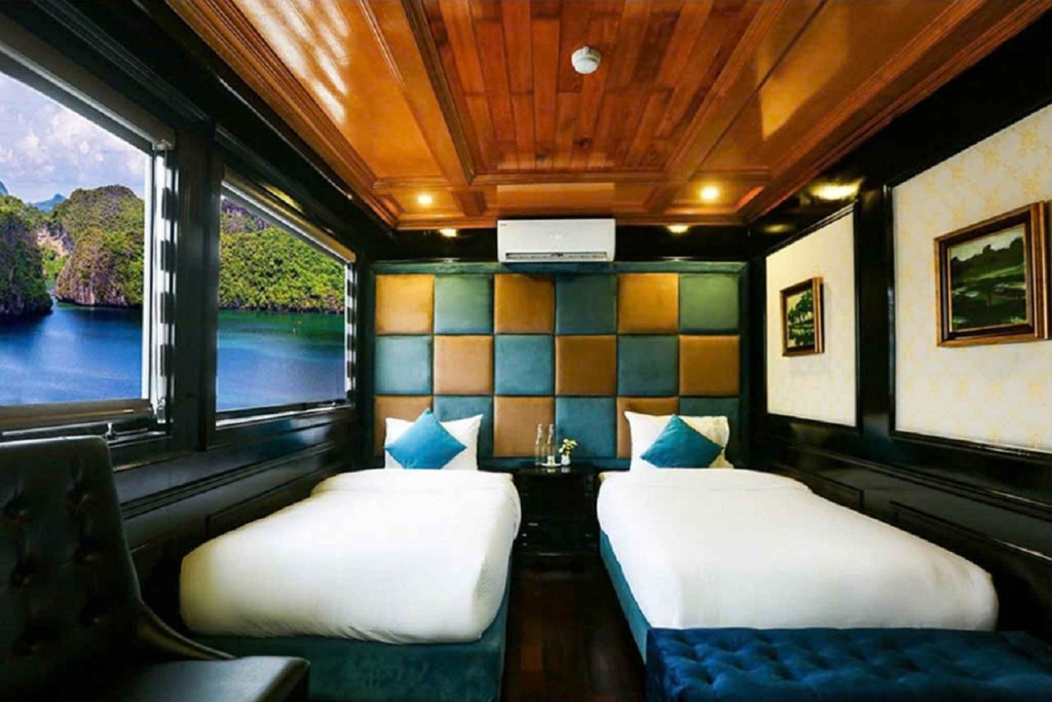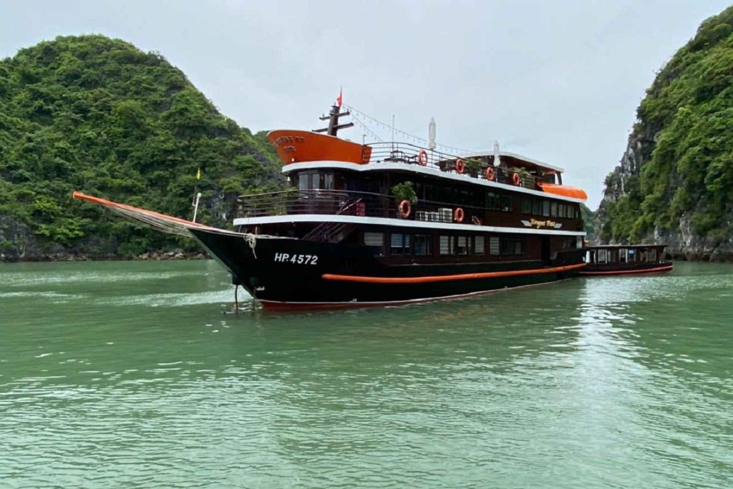 Enjoy the sunset with your loved ones over a cup of tea and kayak through Dark and Bright Cave on this 2-day 1-night cruise from Hanoi to Cat Ba Island and Lan Ha Bay.