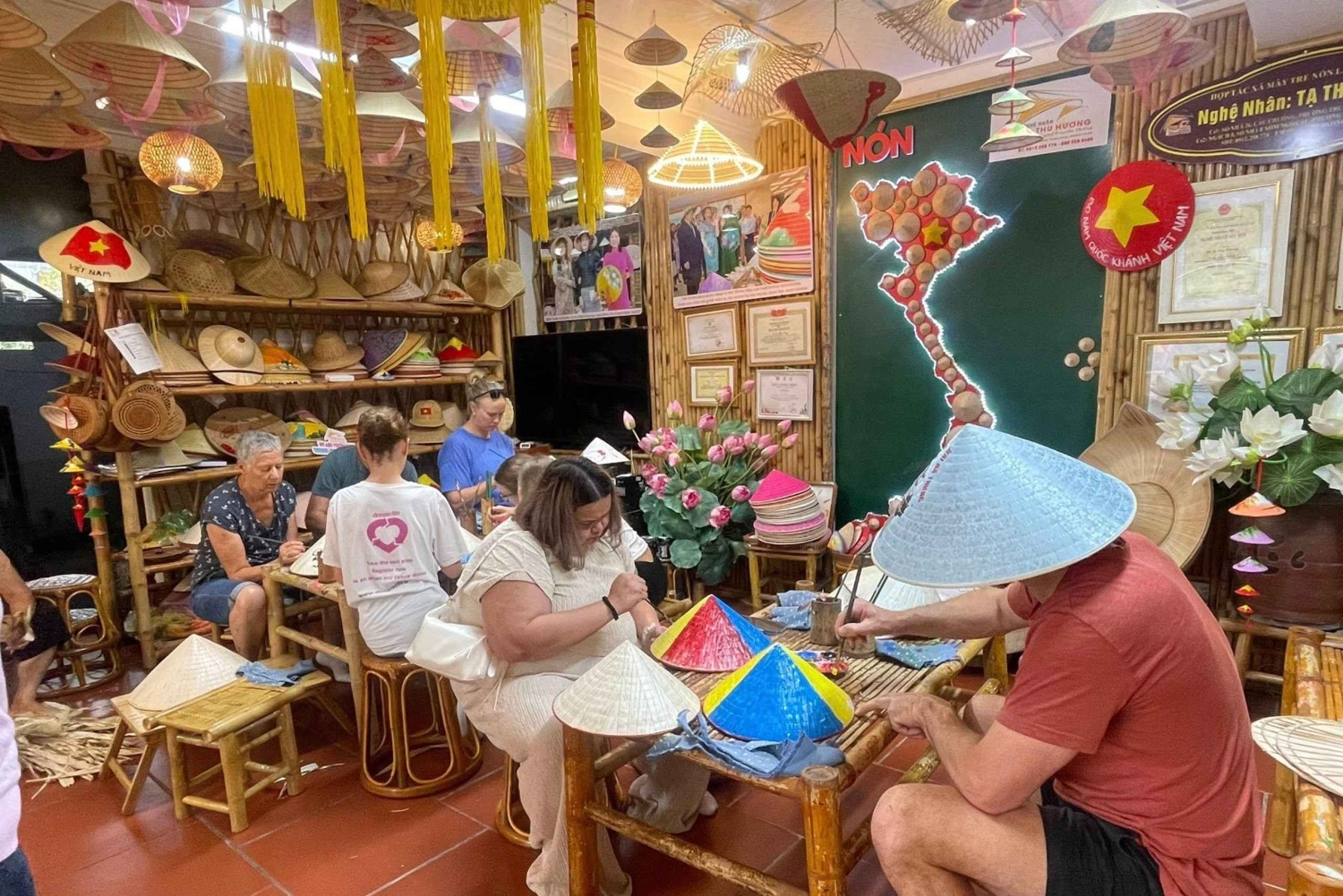 Start your day at the conical-hat village and meet Mrs. Ta Thu Huong, a government-recognized artisan who has appeared on national TV, major magazines, and even been photographed with world leaders for her work in preserving the nón lá craft. She will guide you step by step to make your own conical hat and share stories about her family’s tradition. You can also choose to wear a premium Ao Dai for beautiful cultural photos (optional).